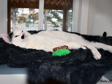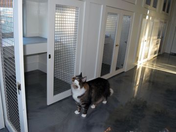The wing backs southwest onto pine trees with bird feeders. This wing is ideal for cats who enjoy basking in the sun; bird watching, as well as the opportunity to view other wildlife, such as squirrels, weasels, porcupine and the occasional coyote. In addition, our horses like to hang out outside this wing.